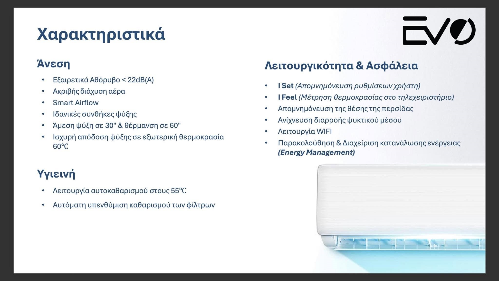 Αθόρυβα, με standard WiFi, λειτουργία αυτοκαθαρισμού και αποστείρωσης, λειτουργία iFeel για ιδανική θερμοκρασία στο χώρο και 10 χρόνια εγγύηση.